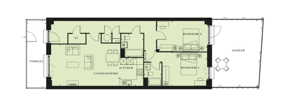 With its own private access through the terrace, this dual aspect apartment also has a private south-west facing garden perfect for entertaining guests. This home has a modern open plan living / dining area with a stylish fitted U-shaped kitchen with integrated appliances. There are two spacious double bedrooms, the main complete with en suite shower room.